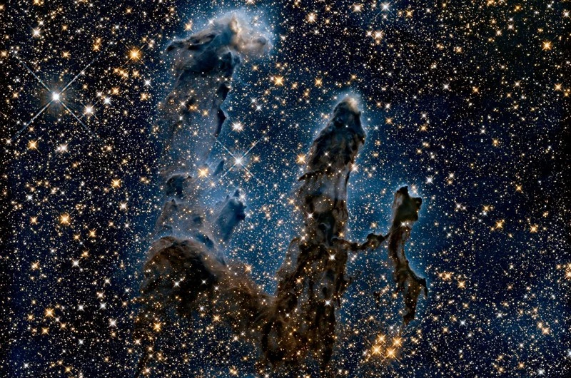 Located in the Eagle Nebula, this structure composed of cold molecular hydrogen clouds constitutes a very active center where many new stars are born.